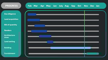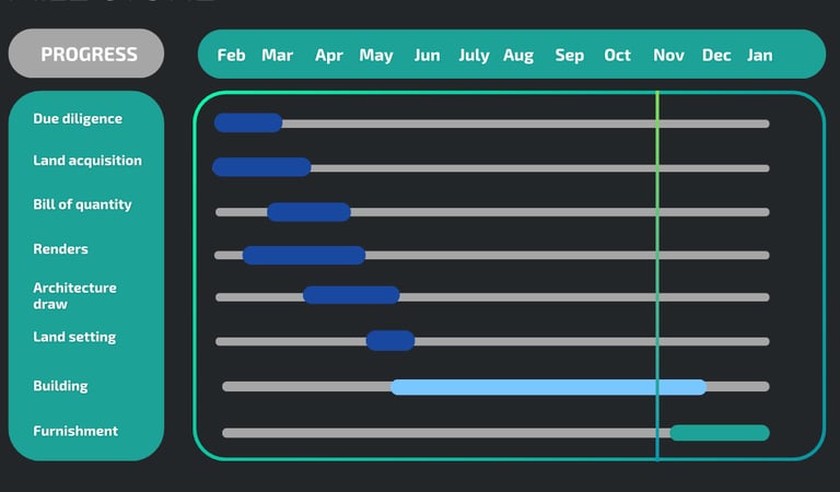 Découvrez ci-dessous le calendrier prévisionnel de construction, réparti sur 11 mois, depuis la location du terrain jusqu’à la livraison finale de la villa. Chaque étape reflète notre engagement en matière de qualité, de rigueur et de transparence